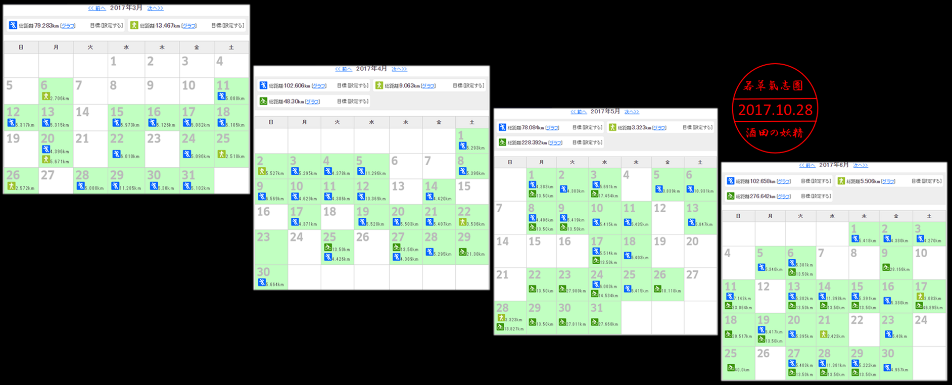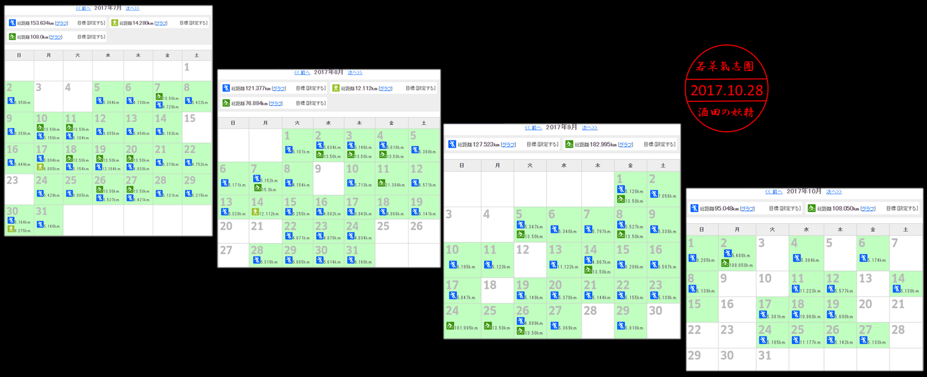 6月…102.65Km 7月…153.63Km 8月…121.37Km 9月…127.52Km…今月…95Km