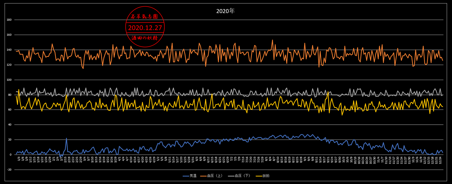 何年か前は気温が下がると血圧は上がっていたけどそういう傾向はみあたらねぇ!