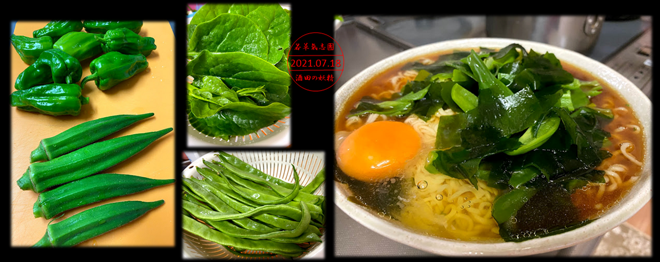 収穫したのがピーマン、オクラ、ツルナ、ささぎ!